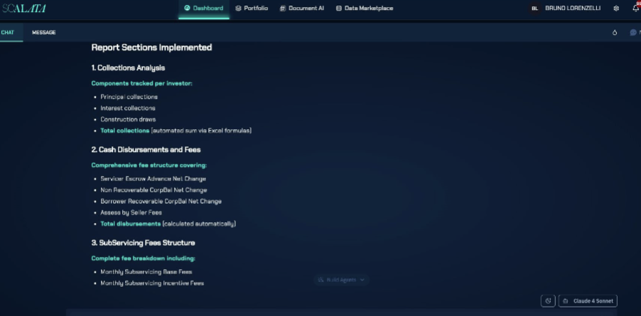 - Natural language report generation — Define report structure (collections, disbursements, fees, reconciliation, net remittance) in plain English